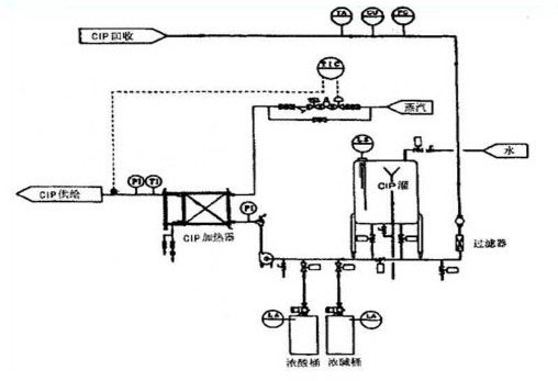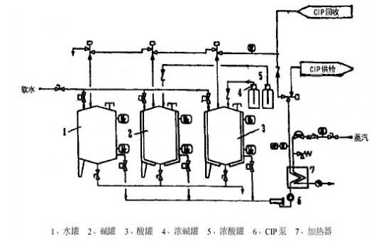 (3)被清洗的罐或管路與CIP清洗裝置通過配管形成回路,清洗結束后將清洗液排放。