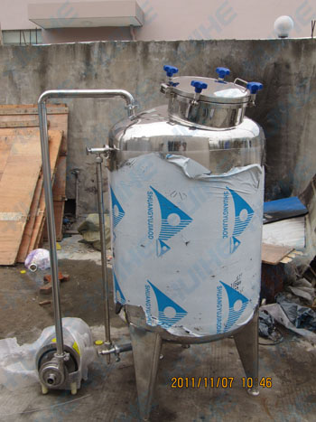 開放式發(fā)酵罐:將經(jīng)過破碎、二氧化硫處理、成分調(diào)整或不調(diào)整的葡萄果漿,用泵送入開口式發(fā)酵桶(池)至桶容約4/5,留空位約1/5預(yù)防發(fā)酵時皮渣沖出桶外,最好在一天內(nèi)沖齊。加入培養(yǎng)正旺盛的酒母3-5%乃至10%(按果漿量計),根據(jù)具體情況而定。
