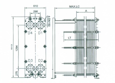 板式換熱器是由固定擋板、板片、移動擋板、立柱、上導軌、下導軌及固定螺栓組成。在固定擋板及移動擋板之間是一系列被固定的板片。每片板片均有墊圈,所以板片間構成相互平行的封閉流道,介質(zhì)在每兩塊板片之間交替流動。